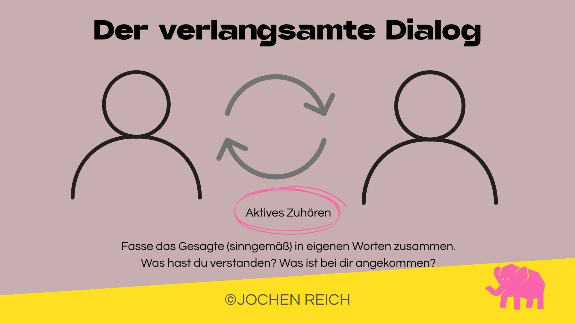 Der verlangsamte Dialog – der Name sagt es schon – bringt Ruhe in hitzige Gespräche. Diese Gesprächstechnik stammt aus der Mediation und hilft Konfliktparteien, sich wirklich zuzuhören. In der Mediation nennen wir das auch Paraphrasieren oder Spiegeln.